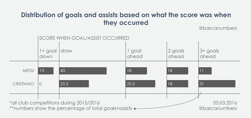 Estadísticas de esta temporada, sobre la que nadie ha discutido que Ronaldo no ha estado a su mejor nivel (y vaya nivel) y en comparación con Messi, del que nadie duda que es el mejor del mundo. Vaya novedad. Hablando de esta temporada, como si sus 27 goles no valiesen para nada, por ahora ya ha marcado el primer gol de la eliminatoria contra la Roma (que resulta que ahora tampoco es un equipo que merezca la consideración de rival importante).